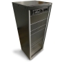 The 19-slot card cage in the rack model can contain up to 16 switching cards (256 remote stations). The rack also houses the 24Vdc power supply, and up to six 60-watt power amplifiers. A single power amplifier is recommended for each set of 64 remote stations.